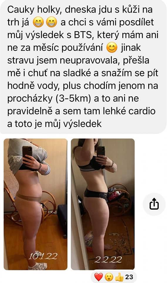 Abych nepěla chválu na BTS bez znatelného výsledku, ráda sdílím foto se svou změnou po 3 měsíčním užívání BTS. Pravda je, že jsem změnila stravu a více se hýbu, ale protože už jsem několikrát procházela tímto bojem, vím, že BTS mi fakt hodně pomáhá a bez něj bych takové výsledky určitě neměla.