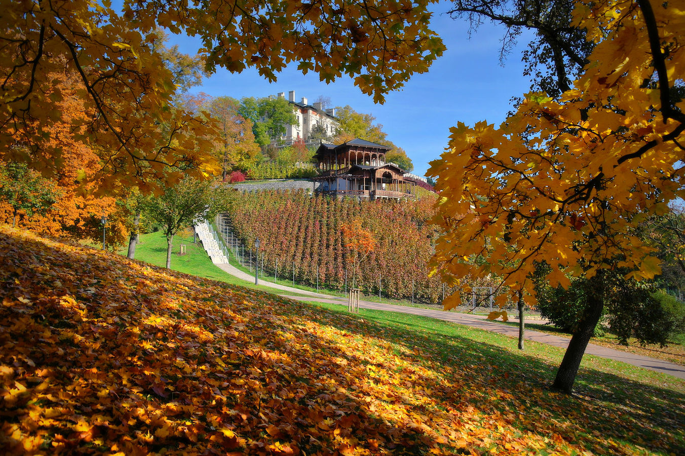 A teď něco k historii.... Církevní vinice zde vyrostly už ve 13. století a boom odstartovaný příkazem Karla IV. sázet révu v Praze a okolí je ještě zmnožil. V průběhu staletí se však i zde v Horách viničních (Vinohrady) měnily v pole, sady, zahrady. V 60. letech 19. století koupil rozsáhlé pozemky stavitel Moritz Gröbe a vybudoval výstavní sídlo s parkem, na navážce ze stavby Vinohradského tunelu pak nově založil i vinici. Jako jedna z mála plodila i po 2. světové válce. Na přelomu tisíciletí ji převzala MČ Praha 2, a ta se pustila do rozsáhlé rekonstrukce celých Havlíčkových sadů. Zachránila jak vinici o rozloze 1,7 ha, tak ceněný dřevěný Viniční altán a rovněž dala vzniku i novému Sklepu Grébovk (zdroj Prague.eu)